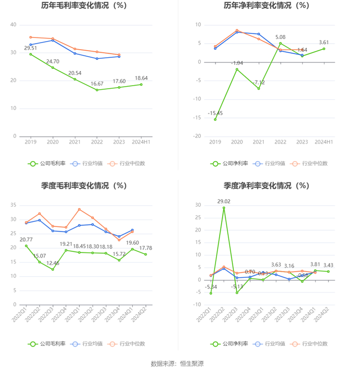 2024年上半年,公司毛利率为18.64%,同比上升0.27个百分点;净利率为3.61%,较上年同期上升1.53个百分点。从单季度指标来看,2024年第二季度公司毛利率为17.78%,同比下降0.52个百分点,环比下降1.82个百分点;净利率为3.43%,较上年同期下降0.20个百分点,较上一季度下降0.38个百分点。