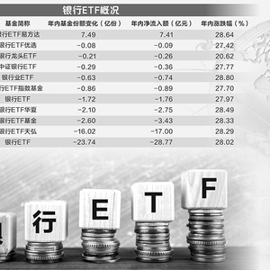 其中,银行ETF(512800)、银行ETF天弘(515290)、银行ETF基金(512700)的基金份额分别在今年减少了23.74亿份、16.02亿份、2.6亿份,资金净流出28.77亿元、17亿元、3.43亿元,而同期三只基金分别上涨了28.02%、28.29%、28.33%。