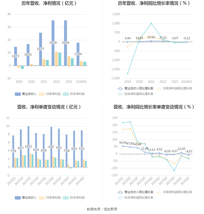 根据半年报,公司第二季度实现营业总收入9.01亿元,同比下降8.67%,环比增长0.96%;归母净利润1.87亿元,同比下降28.41%,环比增长15.88%;扣非净利润1.54亿元,同比下降34.52%,环比下降0.75%。