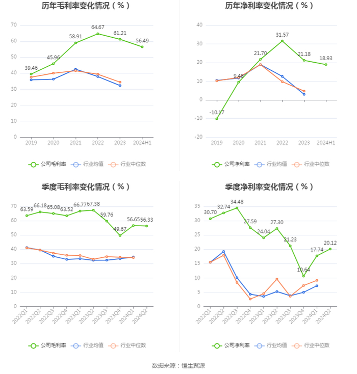 2024年上半年,公司毛利率为56.49%,同比下降10.61个百分点;净利率为18.93%,较上年同期下降6.90个百分点。从单季度指标来看,2024年第二季度公司毛利率为56.33%,同比下降11.05个百分点,环比下降0.32个百分点;净利率为20.12%,较上年同期下降7.18个百分点,较上一季度上升2.38个百分点。