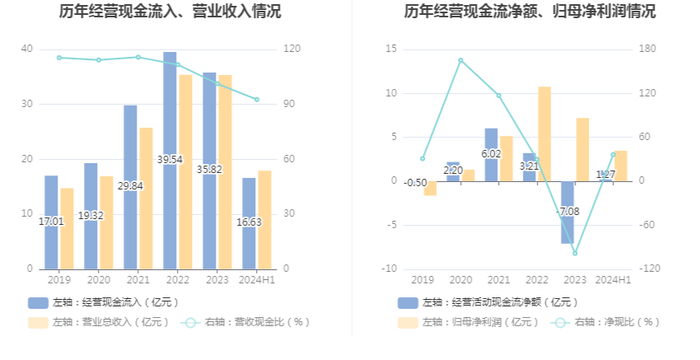2024年上半年,公司营业收入现金比为92.67%,净现比为36.52%。
