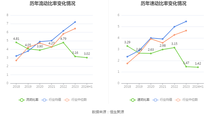 2024年上半年,公司流动比率为3.02,速动比率为1.42。
