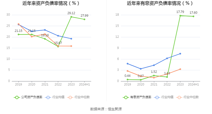 在偿债能力方面,公司2024年上半年末资产负债率为27.99%,相比上年末下降1.13个百分点;有息资产负债率为17.60%,相比上年末下降0.19个百分点。