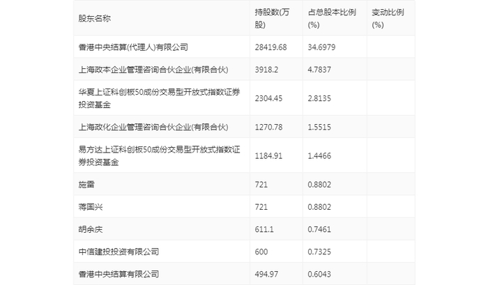 半年报显示,2024年上半年末公司十大流通股东中,持股最多的为香港中央结算(代理人)有限公司,占比34.70%。十大流通股东名单相比2024年一季报维持不变。在具体持股比例上,华夏上证科创板50成份交易型开放式指数证券投资基金、易方达上证科创板50成份交易型开放式指数证券投资基金、胡余庆持股有所上升,上海政化企业管理咨询合伙企业(有限合伙)、香港中央结算有限公司持股有所下降。
