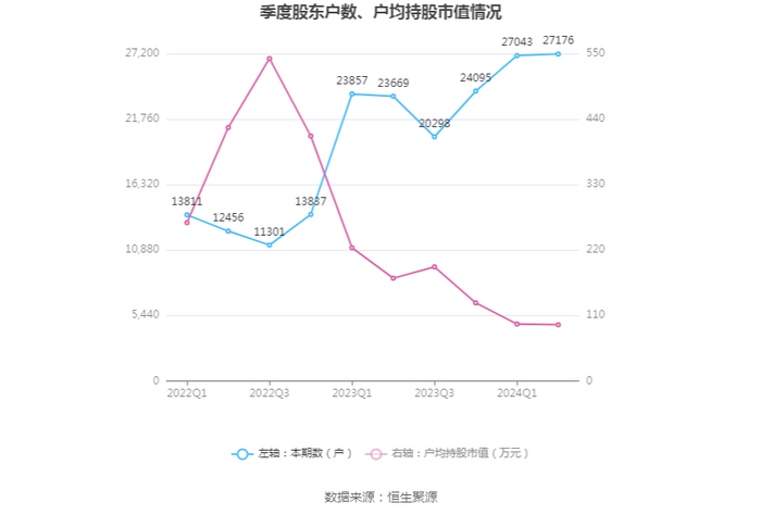 筹码集中度方面,截至2024年上半年末,公司股东总户数为2.72万户,较一季度末增长了133户,增幅0.49%;户均持股市值由一季度末的95.75万元下降至94.53万元,降幅为1.27%。