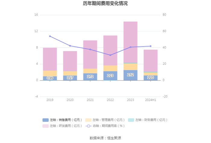 2024年上半年,公司期间费用为7.50亿元,较上年同期增加3417.19万元;期间费用率为41.81%,较上年同期上升1.95个百分点。其中,销售费用同比下降1.54%,管理费用同比下降4.17%,研发费用同比增长2.41%,财务费用由去年同期的-786.30万元变为1857.89万元。