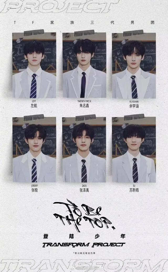8月26日晚,TF家族三代男团宣布成团,左航、朱志鑫、余宇涵、张极、张泽禹、苏新皓6人成团。根据时代峰峻此前公告,TOP登陆少年在一年内将以平番团的形式运营,艺人排名顺序暂时按姓氏笔画为序,一年后再根据相关规则公布最终番位。
