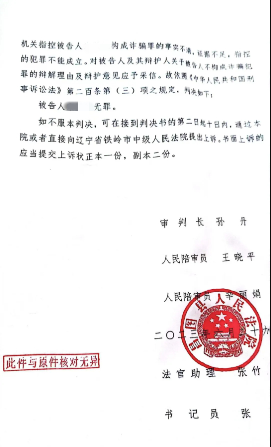 举报者宋先生称,他原是昌图县一名铁路工人,2019年和他人合伙做生意时因经济纠纷被诬告诈骗。2023年,昌图县人民法院、铁岭市中级人民法院先后判决其无罪。