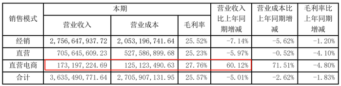 其中线下销售主要分为经销模式、直营模式。经销模式实现营收27.57亿元,同比下降7.14%;直营模式实现营收7.06亿元,同比下降5.97%。