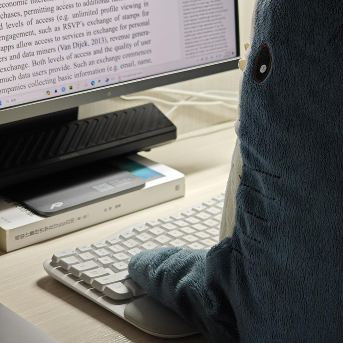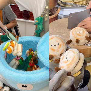 “我会带着它们跟我一起看文献。”姜姜说,虽然知道它们是没有生命的,但它们的陪伴,让自己像是领养了一只宠物,可以满足自己的情感投射:“我看累了,就会把‘鲨琪玛’放在凳子上,让它假装替我看一会儿。‘茄总’要小一些,我会把它放在桌子上和我一起看。”