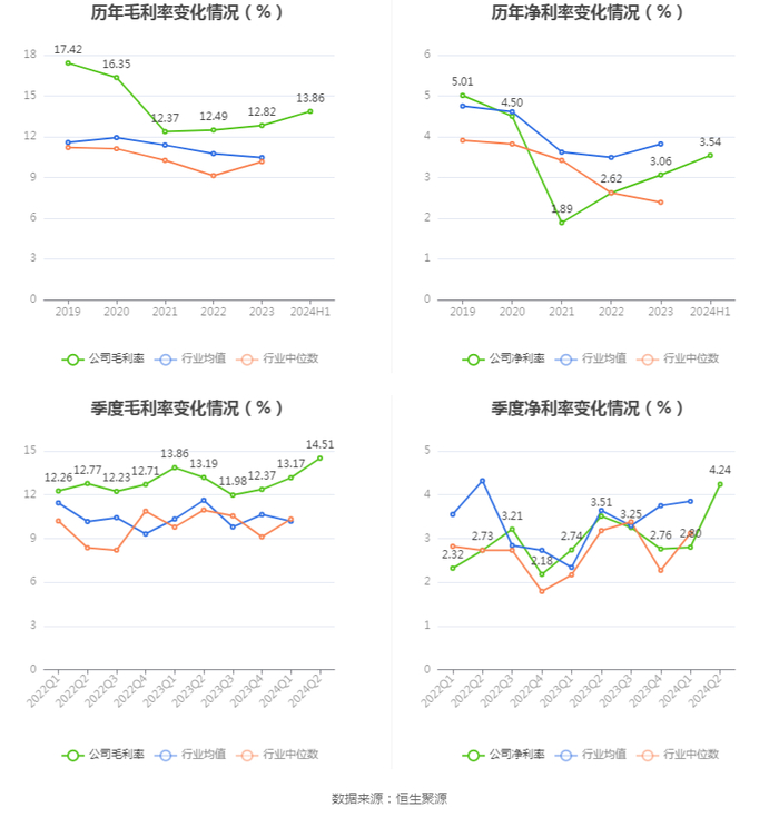 2024年上半年,公司毛利率为13.86%,同比上升0.34个百分点;净利率为3.54%,较上年同期上升0.41个百分点。从单季度指标来看,2024年第二季度公司毛利率为14.51%,同比上升1.32个百分点,环比上升1.34个百分点;净利率为4.24%,较上年同期上升0.73个百分点,较上一季度上升1.44个百分点。