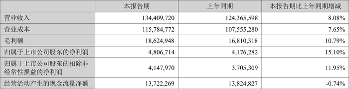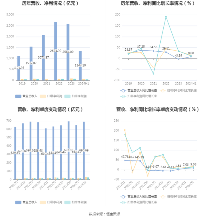根据半年报,公司第二季度实现营业总收入690.69亿元,同比增长9.08%,环比增长5.70%;归母净利润28.95亿元,同比增长17.87%,环比增长51.45%;扣非净利润24.91亿元,同比增长13.84%,环比增长50.35%。