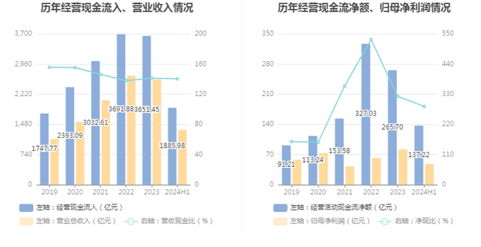 2024年上半年,公司营业收入现金比为140.32%,净现比为285.48%。
