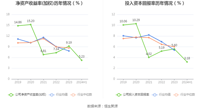 数据显示,2024年上半年公司加权平均净资产收益率为5.23%,较上年同期增长0.51个百分点;公司2024年上半年投入资本回报率为3.18%,较上年同期增长0.42个百分点。