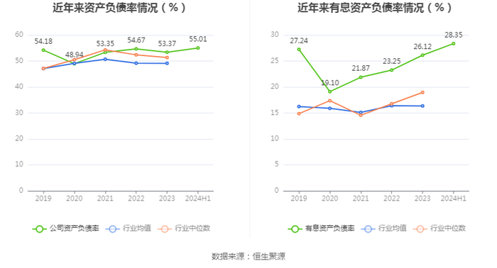 在偿债能力方面,公司2024年上半年末资产负债率为55.01%,相比上年末上升1.64个百分点;有息资产负债率为28.35%,相比上年末上升2.23个百分点。