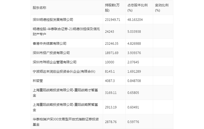 半年报显示,2024年上半年末公司十大流通股东中,持股最多的为深圳明德控股发展有限公司,占比48.16%。十大流通股东名单相比2024年一季报维持不变。在具体持股比例上,深圳明德控股发展有限公司、明德控股-华泰联合证券-21明德EB担保及信托财产专户、香港中央结算有限公司、深圳市招广投资有限公司、深圳市玮顺企业管理有限公司、林哲莹、上海重阳战略投资有限公司-重阳战略才智基金、上海重阳战略投资有限公司-重阳战略聚智基金、华泰柏瑞沪深300交易型开放式指数证券投资基金持股有所上升,宁波顺达丰润创业投资合伙企业(有限合伙)持股有所下降。