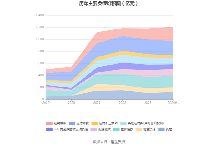 负债重大变化方面,截至2024年上半年末,公司短期借款较上年末增加30.02%,占公司总资产比重上升2.55个百分点,主要系新增借款导致;其他流动负债较上年末增加1364.35%,占公司总资产比重上升1.04个百分点;一年内到期的非流动负债较上年末减少12.81%,占公司总资产比重下降0.52个百分点;其他应付款(含利息和股利)较上年末减少10.06%,占公司总资产比重下降0.49个百分点。