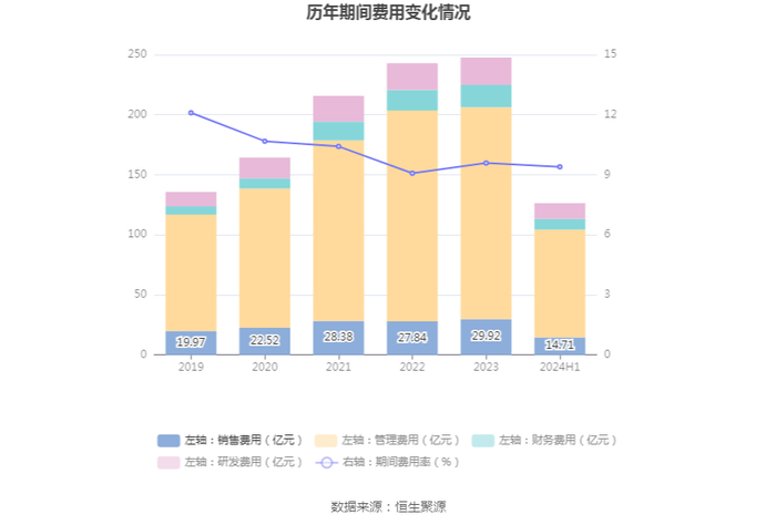 2024年上半年,公司期间费用为126.33亿元,较上年同期增加1.32亿元;但期间费用率为9.40%,较上年同期下降0.65个百分点。其中,销售费用同比增长5.61%,管理费用同比增长0.29%,研发费用同比增长10.76%,财务费用同比下降9.92%。