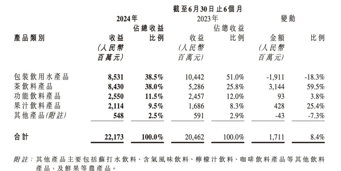 今年上半年包装饮用水业务营收85.31亿元,同比下滑18.3%;收入占比由去年同期的51%下滑至38.5%。