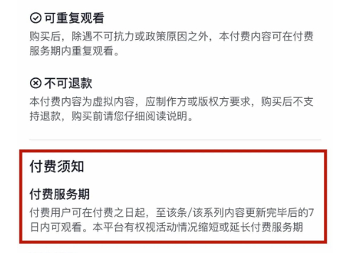 ● “月光剧场”付费页面没有提示有效期或服务期,点开小字“须知”才看到相关规定。