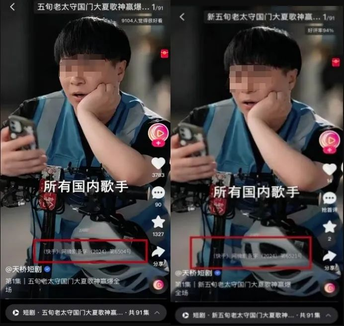 如同一账号发布《五旬老太守国门大夏歌神赢爆全场》与《新五旬老太守国门大夏歌神赢爆全场》,二者虽然名字一字之差,但是剧情内容完全一样,前者片头显示备案号是“网微剧备字(2024)第6504号”,后者显示备案号是“网微剧备字(2024)第6521号”。