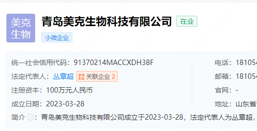 根据国是直通车报道,企查查APP显示,报道中提及的青岛美克生物科技有限公司成立于2023年3月,注册资本100万元人民币,法定代表人为丛章超,经营范围含细胞技术研发和应用、医学研究和试验发展、人体基因诊断与治疗技术开发等,由丛章超、石鹏共同持股。2023年年报显示,该公司参保人数为2人。