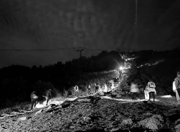 报团、组队或独行,是去灵山的三种方式。报团,即报名户外登山组织的商业团;组队,即三五好友相约或网上临时招募“爬山搭子”。记者注意到,报团和组队目前占据了夜爬灵山人数的90%,尤其是前者,一辆大巴车就能拉四五十名登山者。