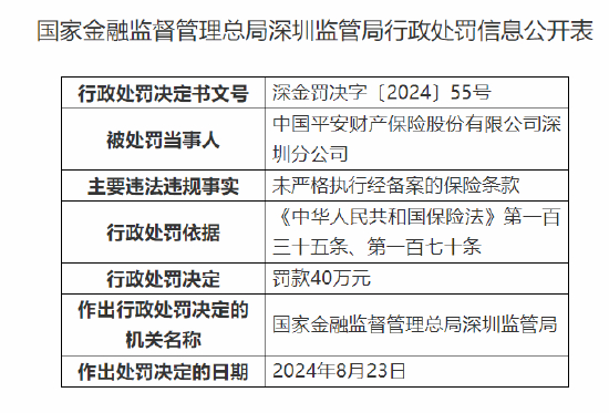 8月29日金融一线消息,国家金融监督管理总局深圳监管局行政处罚信息公开表显示,中国平安财产保险股份有限公司深圳分公司因未严格执行经备案的保险条款,被国家金融监督管理总局深圳监管局罚款40万元