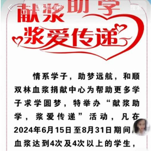 据澎湃新闻转发网友所发标题为“献浆助学,浆爱传递”的海报显示,和顺双林血浆捐献中心为帮助更多学子求学圆梦,特举办“献浆助学,浆爱传递”活动,凡在2024年6月15日至8月31日期间献血献浆达到四次及以上的学生,于8月31日后,凭学生证明在血源登记窗口核实后,可领取200元的助学补助。