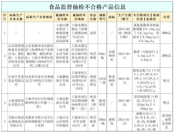 本次抽检信息涉及7大类食品,包括:调味品,方便食品,糕点,冷冻饮品,食品添加剂,食用油、油脂及其制品和特殊医学用途配方食品。抽检样品共计980批次,其中合格975批次、不合格5批次。