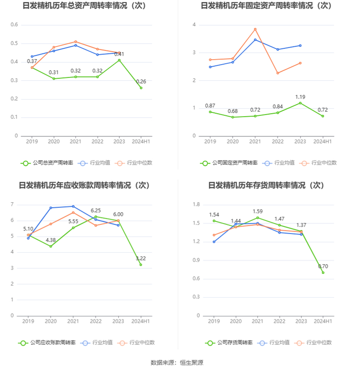 营运能力方面,2024年上半年,公司总资产周转率为0.26次,上年同期为0.15次(2023年上半年行业平均值为0.21次,公司位居同行业14/19);固定资产周转率为0.72次,上年同期为0.45次(2023年上半年行业平均值为1.58次,公司位居同行业18/19);公司应收账款周转率、存货周转率分别为3.22次、0.70次。