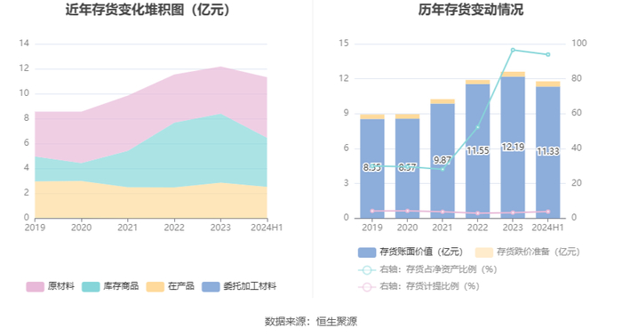 从存货变动来看,截至2024年上半年末,公司存货账面价值为11.33亿元,占净资产的93.93%,较上年末减少8625.62万元。其中,存货跌价准备为4511.33万元,计提比例为3.83%。