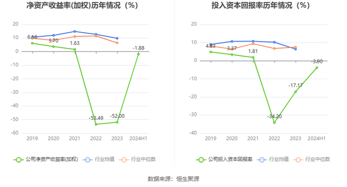 数据显示,2024年上半年公司加权平均净资产收益率为-1.88%,较上年同期增长0.27个百分点;公司2024年上半年投入资本回报率为-3.90%,较上年同期下降3.83个百分点。