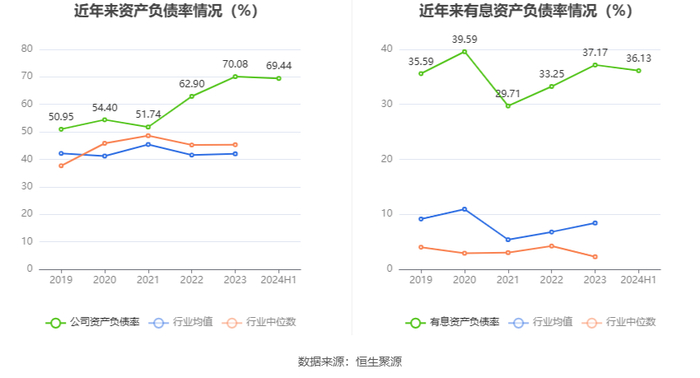 在偿债能力方面,公司2024年上半年末资产负债率为69.44%,相比上年末下降0.64个百分点;有息资产负债率为36.13%,相比上年末下降1.04个百分点。