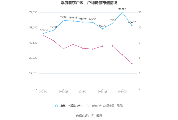 筹码集中度方面,截至2024年上半年末,公司股东总户数为6.04万户,较一季度末下降了1.21万户,降幅16.71%;户均持股市值由一季度末的6.66万元下降至5.02万元,降幅为24.62%。