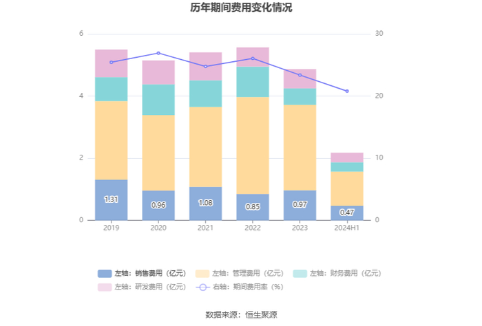 2024年上半年,公司期间费用为2.18亿元,较上年同期减少169.97万元;期间费用率为20.81%,较上年同期下降3.76个百分点。其中,销售费用同比增长16.1%,管理费用同比下降4.35%,研发费用同比增长21.38%,财务费用同比下降22.09%。