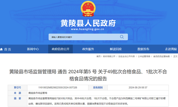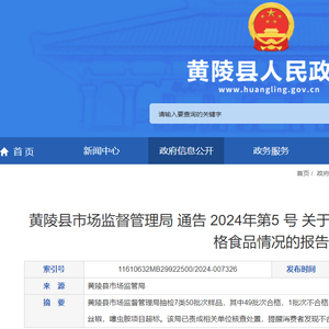 陕西省黄陵县市场监督管理局 通告 2024年第5 号 关于49批次合格食品、1批次不合格食品情况的报告