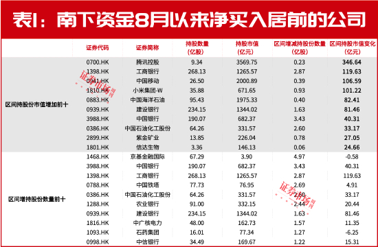 具体到公司层面,南下资金持股市值增加最大的是腾讯控股,其次是工商银行、中国移动和小米集团等,持股数量增加最多的是京基金融国际、中国银行和工商银行等。其中,在持股市值增加前十和持股数量前十中银行股占据了较大权重(见表1)。这可能是与A股的银行股产生了联动,而由于AH折溢价的存在,港股的银行股更具性价比。