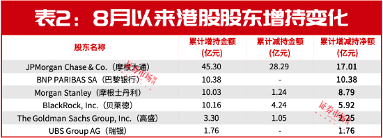 从8月以来港股重要股东变动的数据来看,部分知名国际投行们也普遍开启了“买买买”模式。如摩根大通,在统计区间内累计增持45.30亿元,减持28.29亿元,累计净增持17.01亿元。其中,摩根大通增持招商银行、香港交易所、青岛啤酒股份、创梦天地和药明康德股份数量居前。