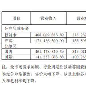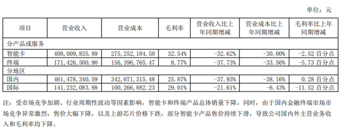 分产品或服务来看,天喻信息在智能卡、终端业务上的应收都明显下滑,智能卡营收比上年同期下降32.62%,终端营收比上年同期下降37.73%。天喻信息表示,受市场竞争加剧、行业周期性波动等因素影响,智能卡和终端产品总体销量下降。