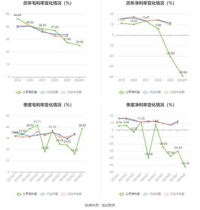 2024年上半年,公司毛利率为25.09%,同比下降5.71个百分点;净利率为-38.98%,较上年同期下降30.80个百分点。从单季度指标来看,2024年第二季度公司毛利率为38.60%,同比上升1.48个百分点,环比上升22.23个百分点;净利率为-52.36%,较上年同期下降59.92个百分点,较上一季度下降22.02个百分点。