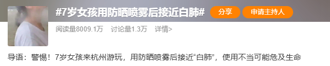 近日,“7岁女孩用防晒喷雾后接近白肺”的话题冲上微博热搜,阅读量达八千多万。