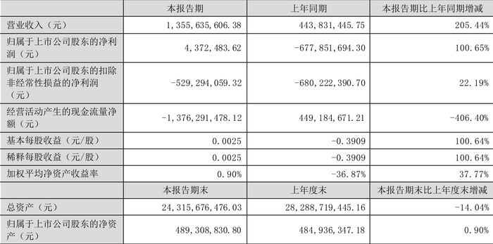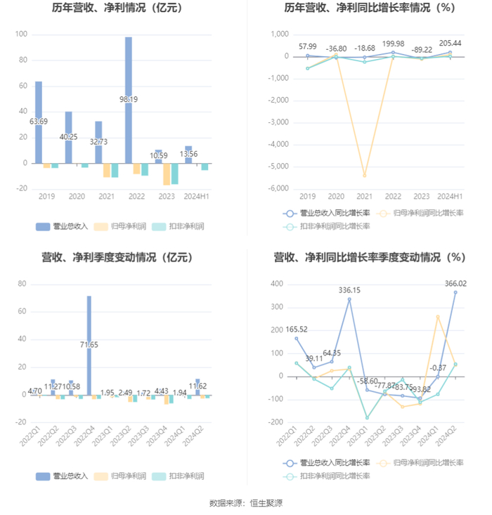 根据半年报,公司第二季度实现营业总收入11.62亿元,同比增长366.02%,环比增长499.48%;归母净利润-2.58亿元,同比增长49.85%,环比下降198.33%;扣非净利润-2.38亿元,同比增长53.88%,环比增长18.46%。