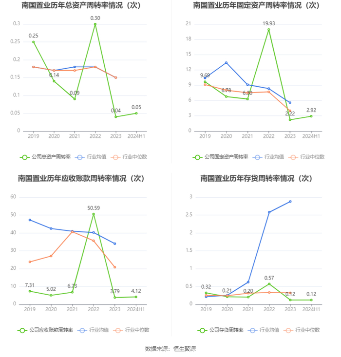 营运能力方面,2024年上半年,公司总资产周转率为0.05次,上年同期为0.02次(2023年上半年行业平均值为0.05次,公司位居同行业10/10);固定资产周转率为2.92次,上年同期为0.92次(2023年上半年行业平均值为2.17次,公司位居同行业8/10);公司应收账款周转率、存货周转率分别为4.12次、0.12次。
