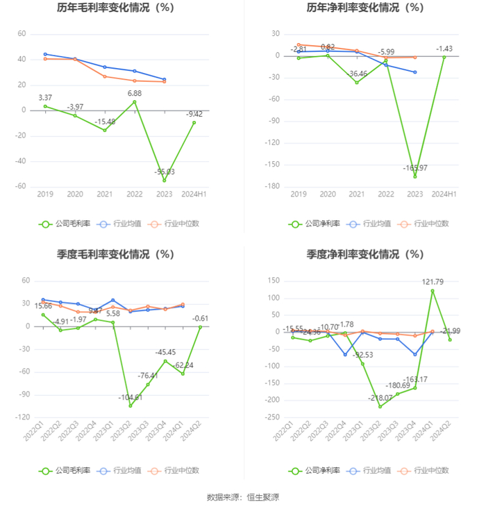 2024年上半年,公司毛利率为-9.42%,同比上升46.90个百分点;净利率为-1.43%,较上年同期上升161.62个百分点。从单季度指标来看,2024年第二季度公司毛利率为-0.61%,同比上升104.00个百分点,环比上升61.63个百分点;净利率为-21.99%,较上年同期上升196.08个百分点,较上一季度下降143.78个百分点。
