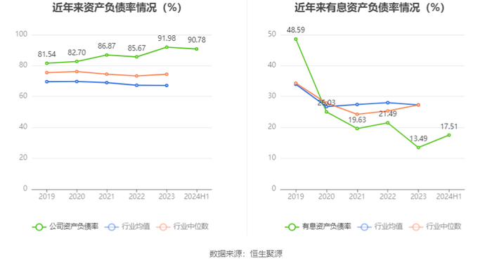 在偿债能力方面,公司2024年上半年末资产负债率为90.78%,相比上年末下降1.20个百分点;有息资产负债率为17.51%,相比上年末上升4.02个百分点。