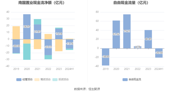 2024年上半年,公司经营活动现金流净额为-13.76亿元,同比减少18.25亿元,主要系预售项目较上年同期减少所致;筹资活动现金流净额9440.64万元,同比增加10.21亿元,主要系偿还融资本息较上年同期减少所致;投资活动现金流净额-1.89亿元,上年同期为8208.41万元,主要系出售子公司股权,合并范围变化导致的现金减少所致。