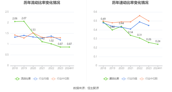 2024年上半年,公司流动比率为0.87,速动比率为0.24。