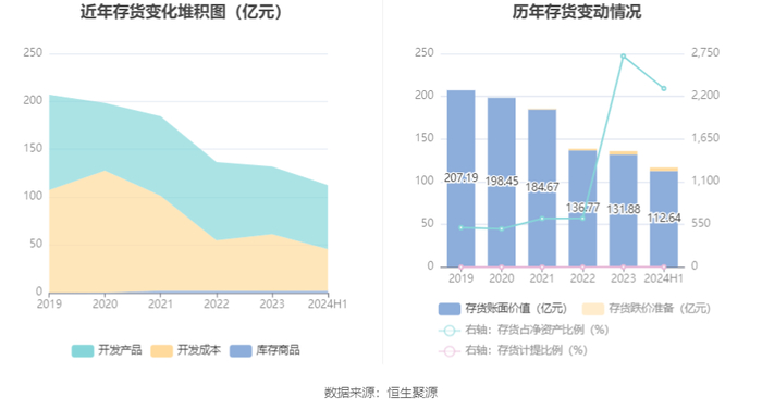 从存货变动来看,截至2024年上半年末,公司存货账面价值为112.64亿元,占净资产的2302.06%,较上年末减少19.24亿元。其中,存货跌价准备为4.05亿元,计提比例为3.47%。