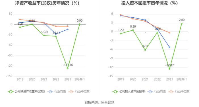 盈利能力方面, 2024年半年度公司加权平均净资产收益率为0.9%,同比上升37.77个百分点。公司2024年上半年投入资本回报率为2.8%,较上年同期上升6.23个百分点。